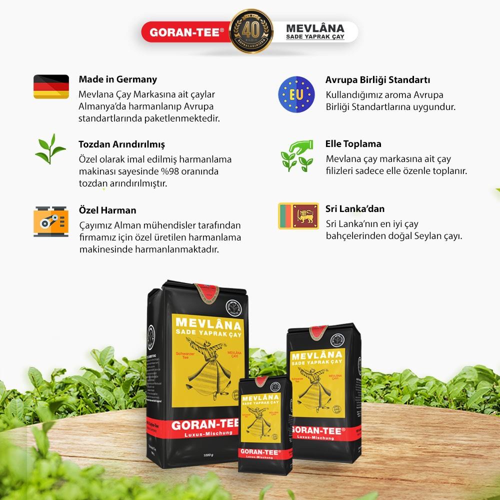 40 yıldır Avrupa’dan tanıyıp, bildiğiniz Mevlana Çay markasına ait tüm ürünler, özel olarak harmanlanarak Almanya’da üretilmektedir. Bu çaylar özel olarak imal edilmiş harmanlama makinesi sayesinde %98 oranında tozdan arındırılmaktadır. Bu makine, Alman mühendisler tarafından firmamız için özel olarak üretilmiştir. Kullanılan aroma ise AB gıda standartlarına uygun olup, kalite kontrol süreçlerimizden geçerek ürünlere eklenmektedir.